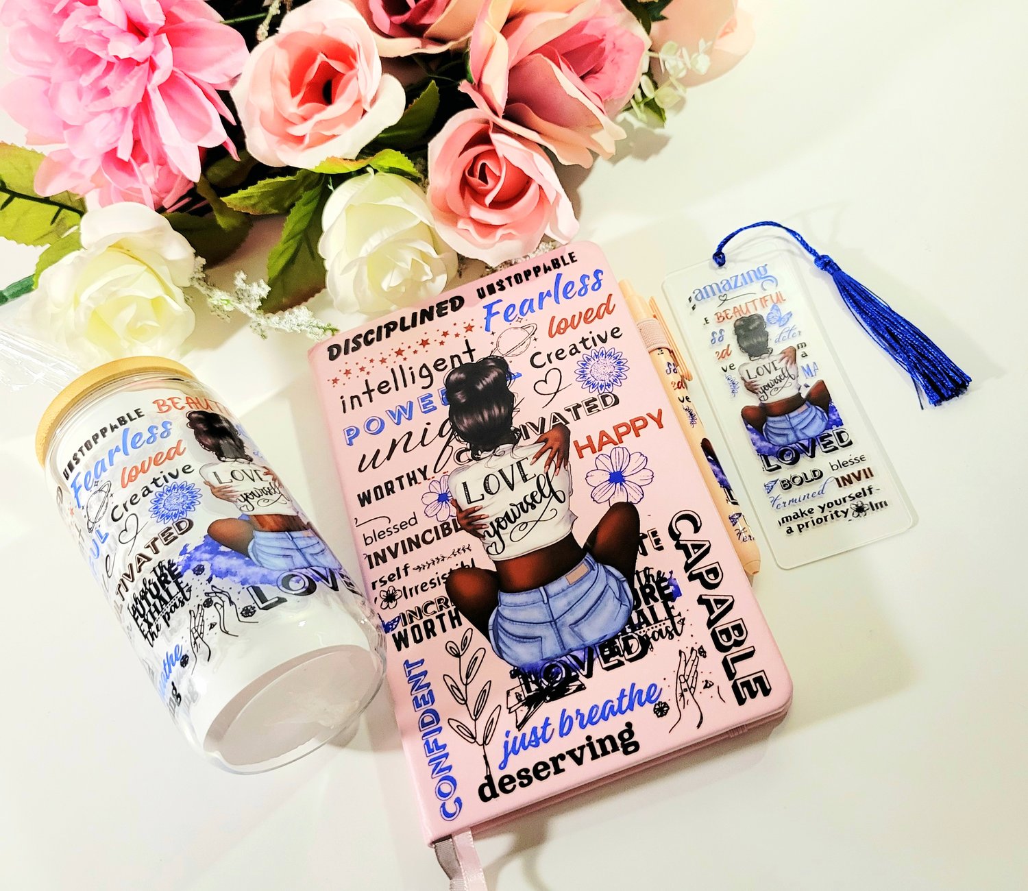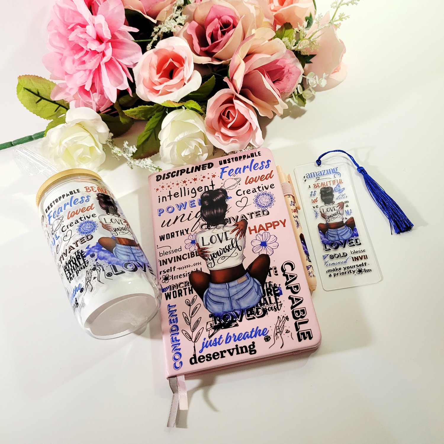 This beautiful Notebook giftset is covered with affirmations that are Inspiring and Intentional! This giftset comes with a matching pen, glass, and bookmark. Start your day with powerful Affirmations and end it with reflections. A wonderful gift for you or someone you love.