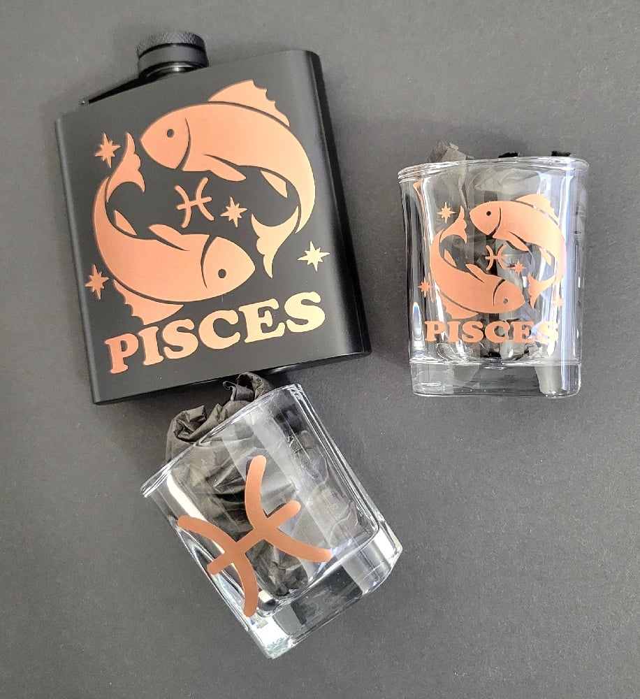 Soft, intuitive, and beautifully expressive—this Pisces-themed drinkware set is designed for the zodiac’s most soulful sign. The set includes a 6 oz matte black stainless steel flask two 2 oz square shot glasses, and a mini funnel, each finished with shimmering rose gold Pisces detailing featuring the fish symbol, zodiac glyph, and celestial accents. A dreamy, gift-ready piece for birthdays, rituals, or any zodiac lover’s collection.