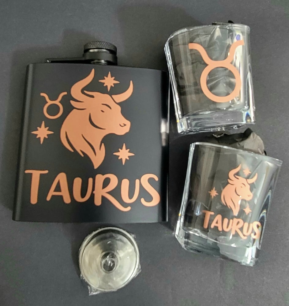 - Includes: 1 Taurus flask (6 oz), 2 square shot glasses (2 oz each), 1 mini funnel